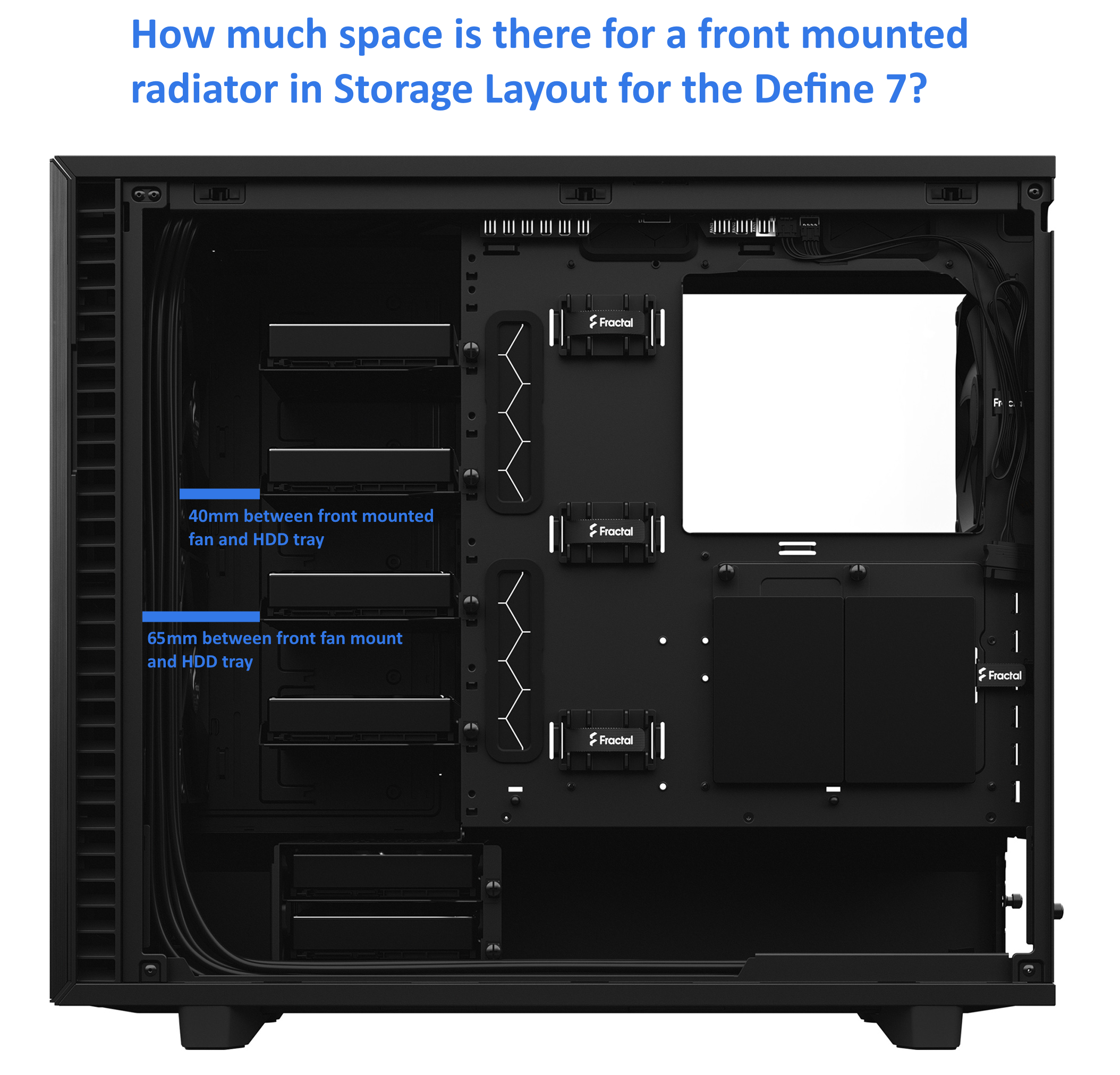 Define 7 & Meshify 2: How much space is there for a front mounted radiator in Storage Layout? Print