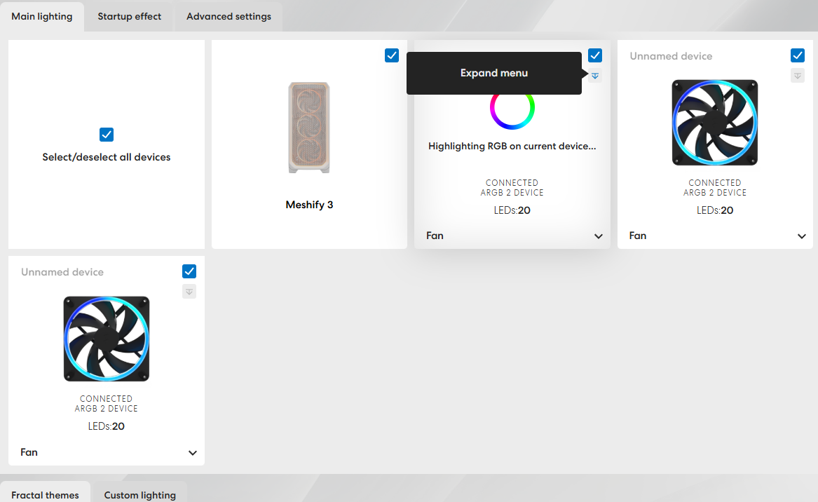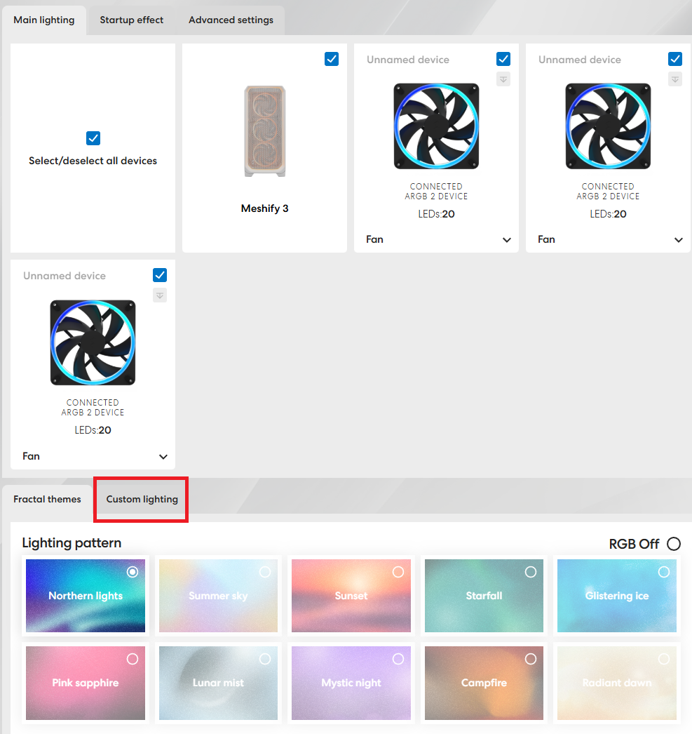 In this screenshot, we have a Meshify 3 Ambience with the included 3 fans installed, all connected to the Adjust Pro Hub. The fans are chained to the hub, and as they utilize ARGB2, you'll be able to control each fan separately. Meshify 3, as you see in the picture, indicate the RGB-strip inside the case and along the front panel, and is identified through the quantity of LEDS it has.