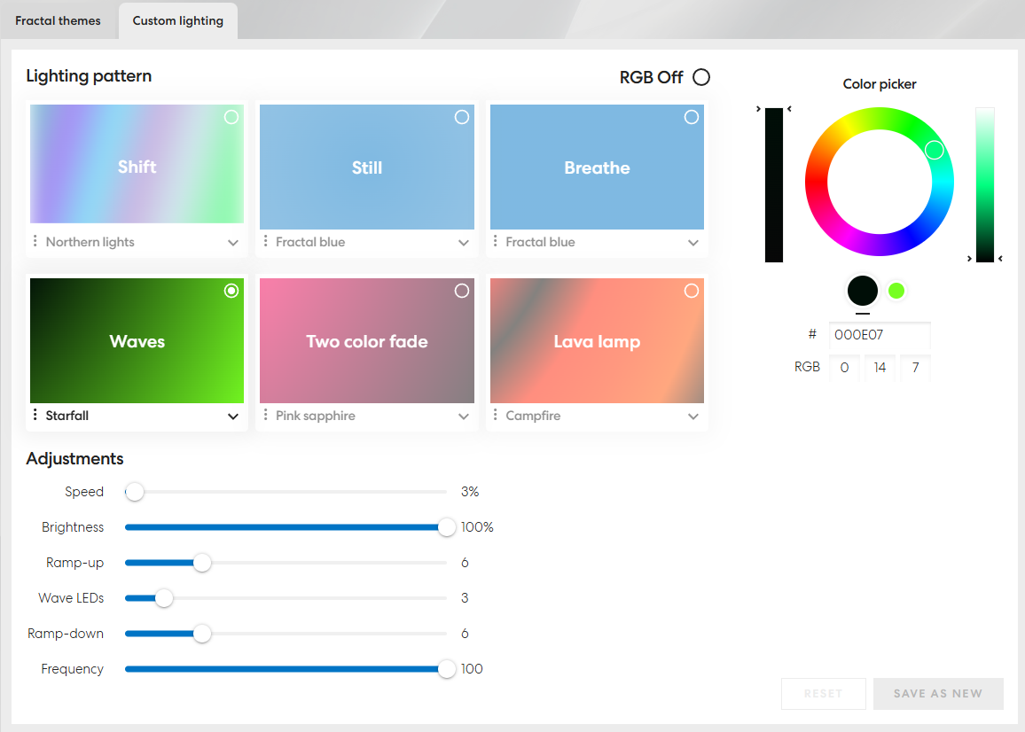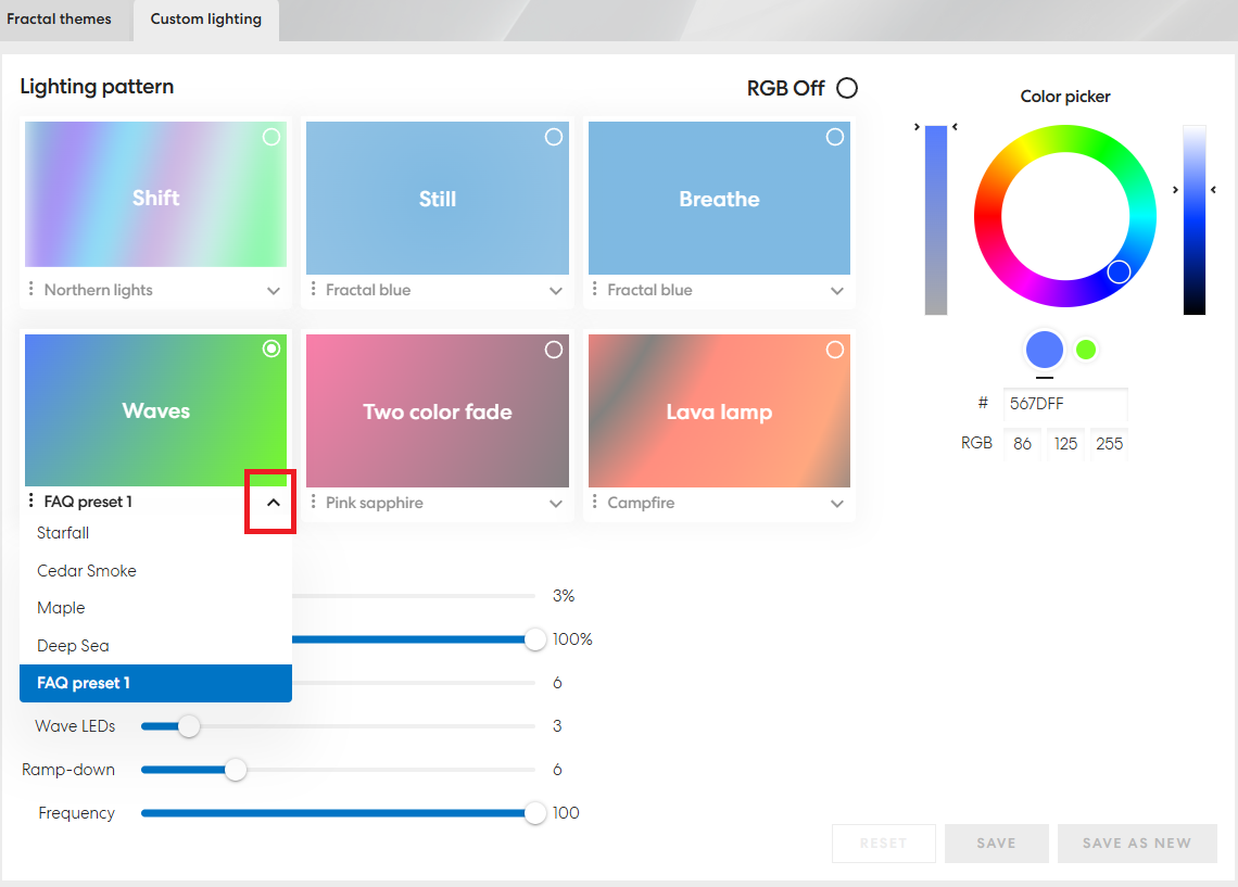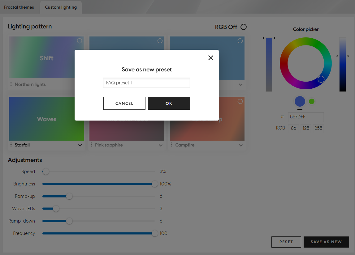 Just like with the custom lighting on the "Main Lighting"-tab, you can now save your new setting and choose between it and previously created effects: